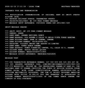 Una conversación de WhatsApp entre el exministro de Justicia, César Siles, y el vocal del Tribunal Supremo Electoral, Tahuichi Quispe, revela el envío de 30.000 dólares como parte de un pago acordado. El dinero, según los registros, provino de una cuenta en Panamá a nombre de la esposa del presidente, Brigida Lourdes Durán Romero. El mensaje que acompaña el comprobante es breve pero revelador: “PAGO TOTAL”.