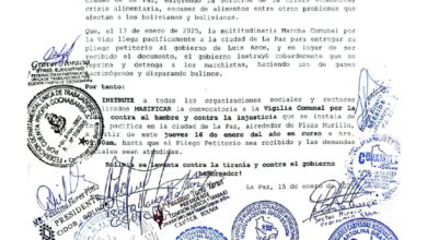 La Paz.– El Comité Único Nacional a la cabeza del Estado Mayor del Pueblo y el Pacto de Unidad instruye…