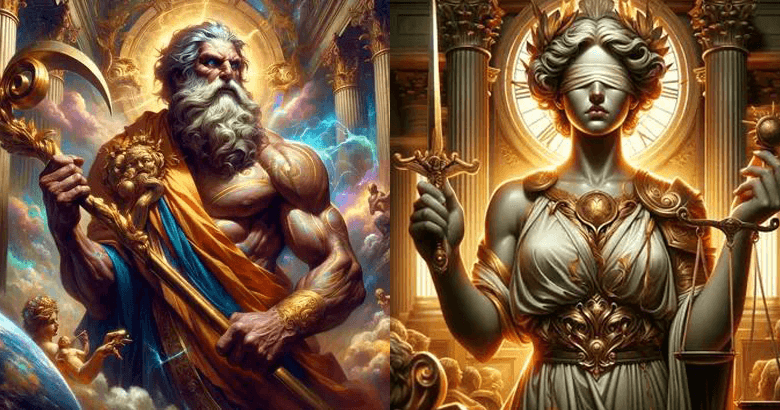 “Cronos y “Themis, como dioses al fin, trabajan juntos, luchan en pareja, uno reivindicando el tiempo y otra, como equilibrista, accionando  a su tiempo,  porque la dama que empuña la espada es  ciega, ya que  tiene  sus ojos cubiertos por una venda.