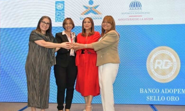 Santo Domingo, RD.- En un acto convocado por el Ministerio de la Mujer de República Dominicana y el Programa de las Naciones Unidas para el Desarrollo (PNUD), el Banco Adopem recibió la certificación en el nivel oro por su destacado compromiso en promover la equidad de género en el entorno laboral. La placa fue entregada a Mercedes Canalda de Beras-Goico, presidenta de la entidad financiera.