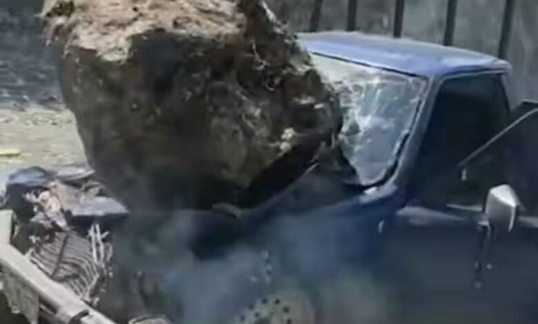 Roca gigante cae sobre vehículo en Jarabacoa