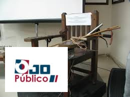 En una cajuela hecha en madera y bordada en cristal, dentro de ella un garrote de tortura de 24 pulgadas y a la izquierda se encuentra la estructura de la cárcel la 40 dentro de una caja de vidrio, mientras que en frente la silla de tormento.